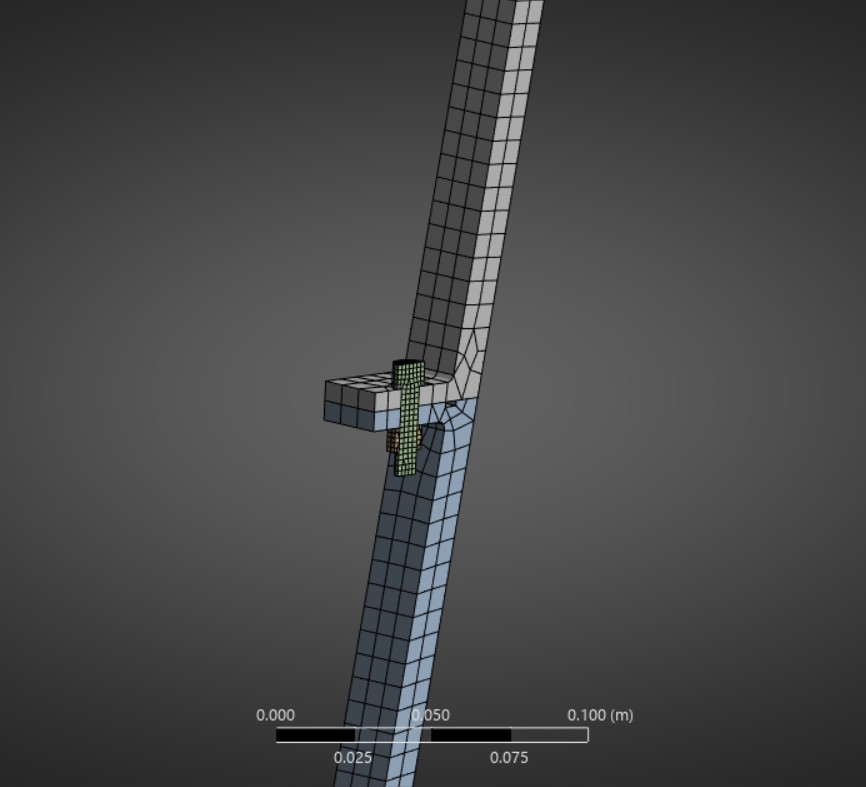 After generating the auto-generated mesh by ANSYS, I added a few changes. The first change was adding a specific sizing to the nozzle and the bolt & nut, with the bolt & nut having a mesh with an element size that is roughly three times finer than the nozzle body. The other change that I made was to add a hex dominant method to the entire geometry, as a cleaner mesh is achieved in this case. The mesh had a total of 26134 nodes and 4255 elements. Additionally, a frictionless boundary condition was added where the mid and top parts of the nozzle meet near the bolt to conduct a more rigorous test of the model. The force from the regen channel was also included in the analysis.