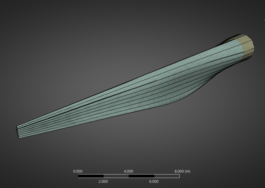 Materials: A custom named material (named homogenous orthotropic; custom inputted youngs modulus and shear modulus) that represents the real material for a wind turbine blade.